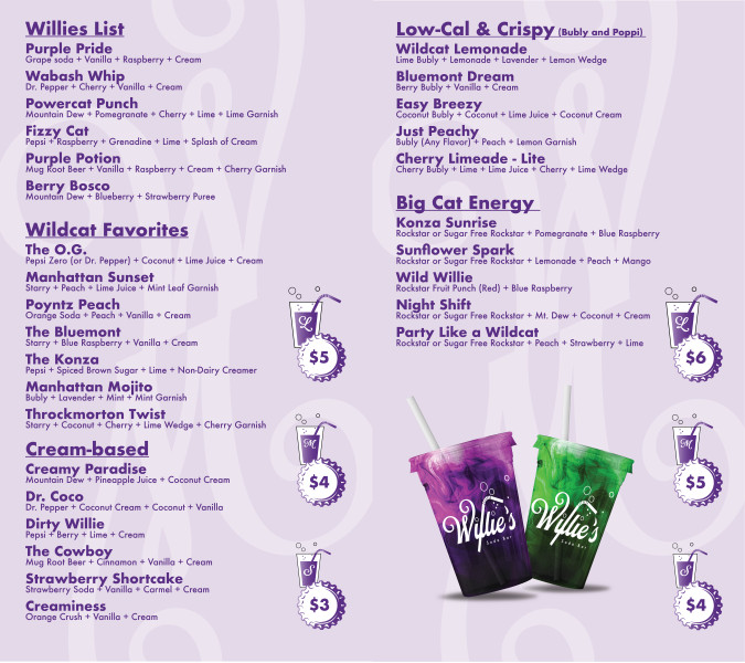 Willie's Soda Bar is your go-to mixed soda pit stop in the heart of the K-State Student Union. With a lineup of bold flavors and fizzy favorites, our student baristas aim is to keep Wildcats refreshed, energized, and on the move. Between our signature and customizable Wildcat drink combinations made with fresh fruit and syrups, Willie's Soda Bar is the sip station for you!