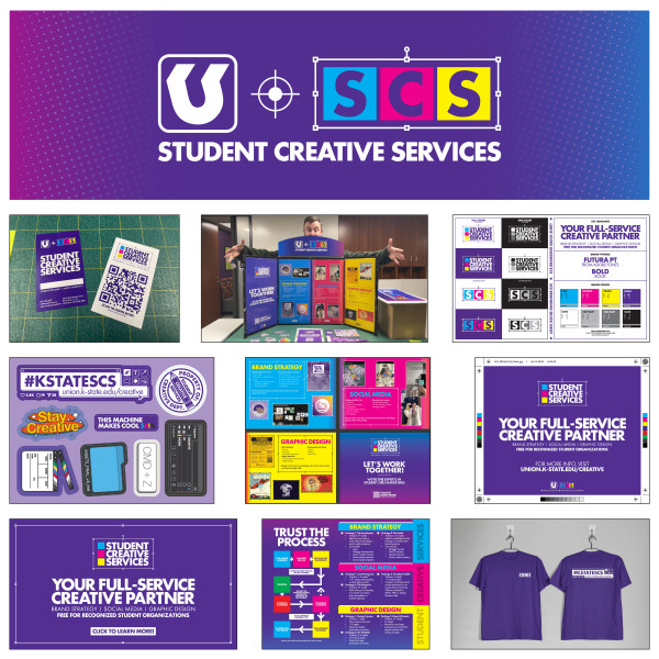 About SCS: Student Creative Services provides comprehensive brand strategy, design and social media strategies to K-State student organizations, promoting professional excellence, creativity and collaboration among both clients and student staff.