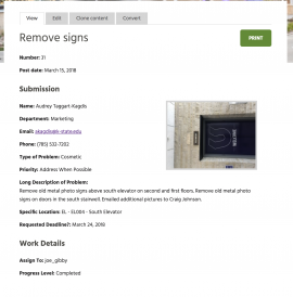 Please complete the request to remove old metal photo signs in the south stairwell as requested in Workorder #31. See attached request.