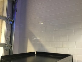Need to drill a hole for the security camera in fast tracks. The camera is going to look at the counter above the pizza warmer. A black dot has been marked where we would like the hole drilled