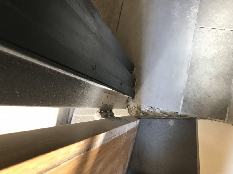 Missing floor tile and grout.