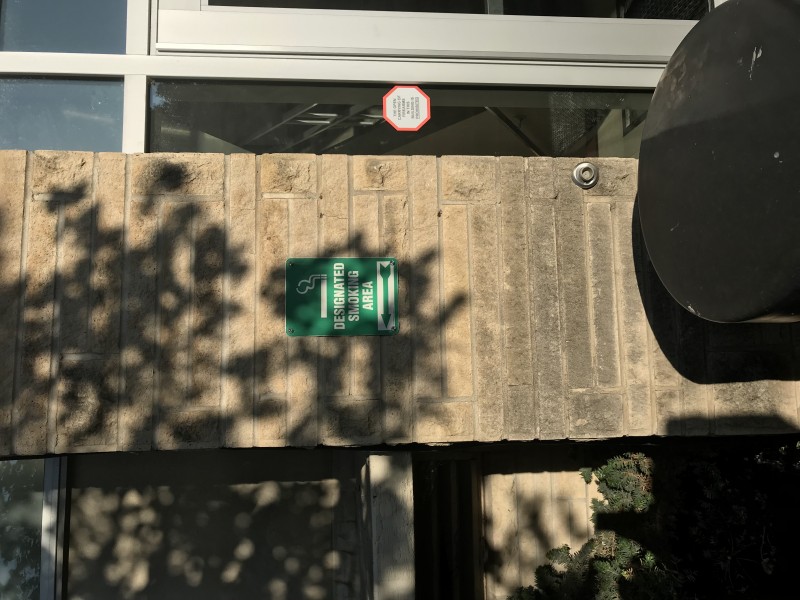 There is a designated smoking area sign on the lower east side of the building that needs to be removed.