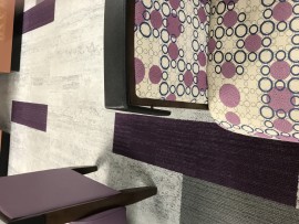 Arm pad has pulled out of front of the chair and should be re-glued. Chair is in the middle of the second floor concourse near the piano.