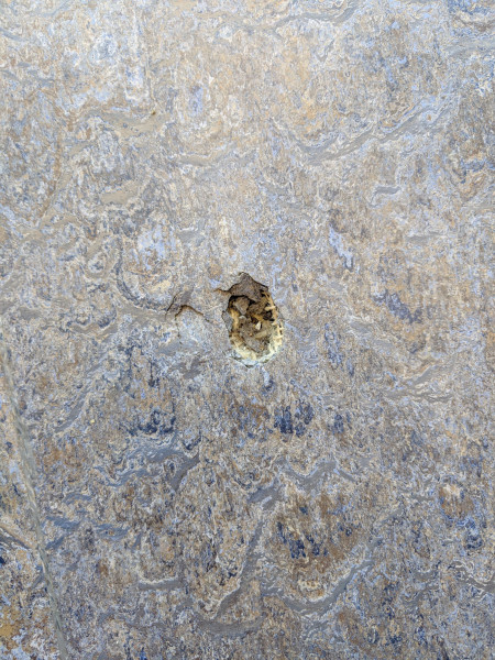 There is a hole in the flooring in West Dining located near the beginning of the line to the Salad Spot. It appears that the floor will need to be patched and the flooring replaced.