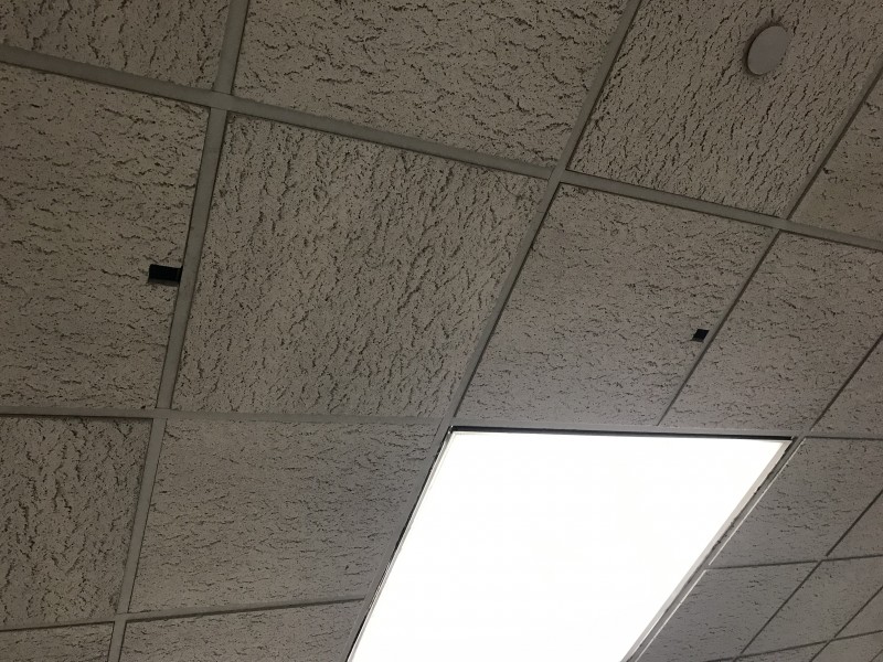 There are two ceiling tile just outside of the KSU Hallway that were cut to accommodate a former sign. The sign has been removed and these two tile need to be replaced.