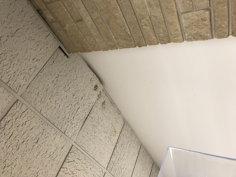 Several ceiling tile in west dining have been stained by leaks and need to be painted or replaced.