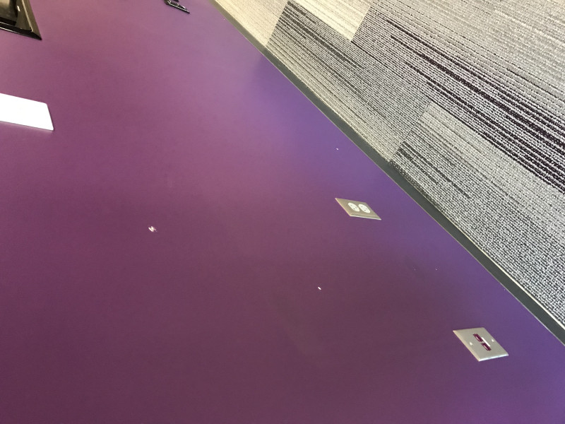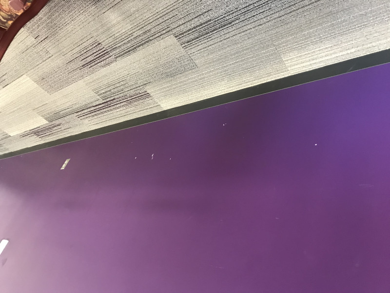There are a large number of dings in the east (purple) wall in the Bluemont Room. Some of these need to be patched, and the wall needs to be repainted to cover the many blemishes.