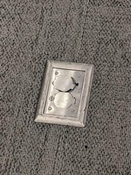 The floor power cover in Wildcat Chamber is broken and needs replaced or repaired. It is located in the front center of the room.