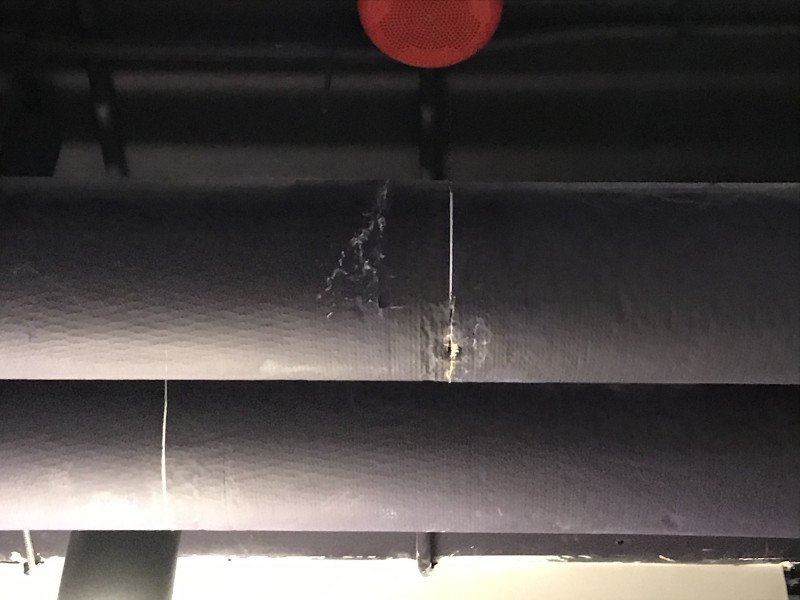 Two of the chilled water pipe seams on first floor just south of the Art Gallery are sweating badly. Install insulating tape on these joints to reduce or eliminate this condensation.