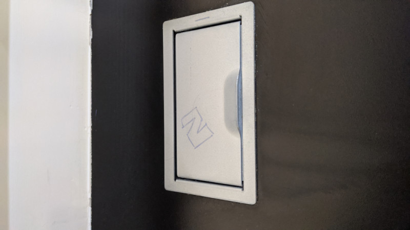 Someone marked on the outlet cover in the center of the ground floor computer stations in front of the computer store. Alcohol usually works to remove it but it may need something stronger.