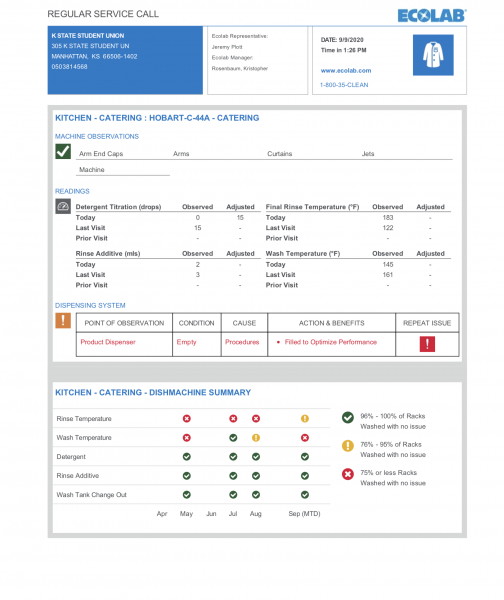 The dishwashing machine in the north catering kitchen does not reach the required temp for the rinse cycle that is necessary to meet KDA Health Dept safety. The temp on the rinse cycle needs to be at 180 degrees. I have attached the latest Ecolab report showing the cycles have met temp requirements less than 75% of the time.