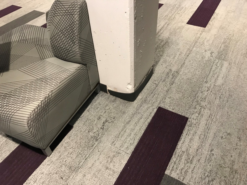 There is a piece of carpet edging around a column near the east elevator on ground floor that is starting to fall off and needs repair.