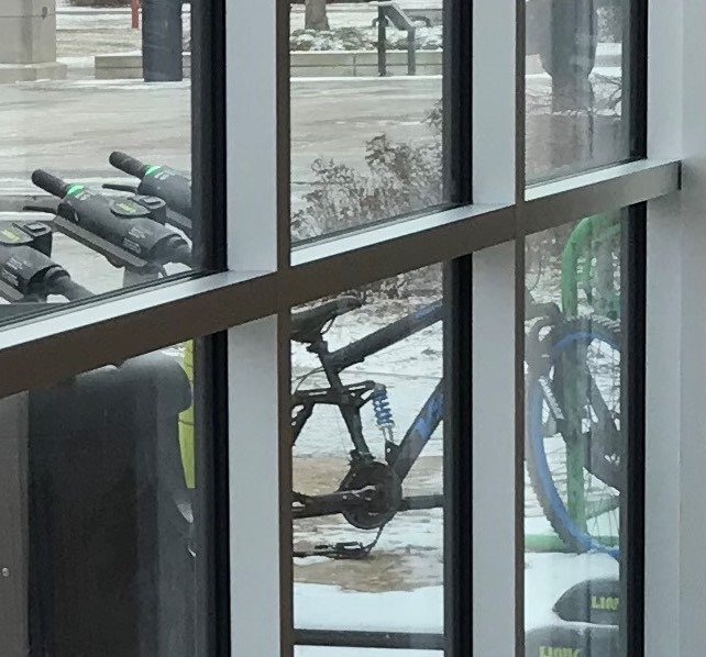 There is a bicycle frame with a removed rear wheel chained in the bike rack on the north side of the Union. When possible cut the cable and remove and recycle.