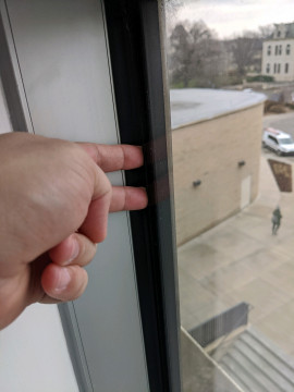 There is a gap between the glass pane and the seal and frame of a window on the thirds floor in the small hallway that leads to the Room 301 data closet and roof access hatch. The pane is on the far left bottom pane.
