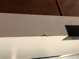 Something has damaged a wall corner at the end of the locker wall near bulk storage on ground floor and it needs repair.