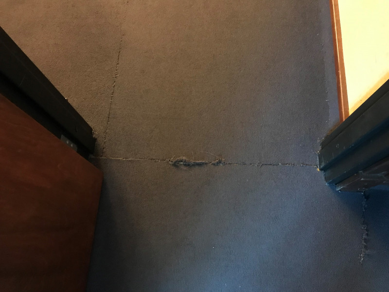 The seam between these two rooms has become unsightly. Install as plastic threshold in the doorway to improve the appearance.