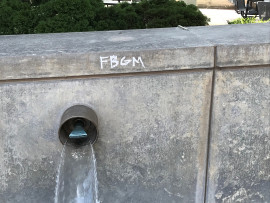 Water feature on Bosco Plaza was defaced with paint. Will hope solvent will remove this.