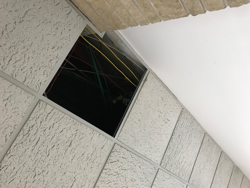 A ceiling tile damaged from a water leak is missing and will need to be replaced.
