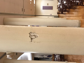 One of the columns in S/U Ballroom has been hit with a wall section and the plaster is broken of and requires repair.