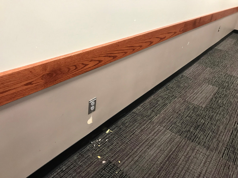 There are a number of locations in Cottonwood Room that need to be patched and painted. One in particular on the north wall where plaster has come loose around an outlet.
