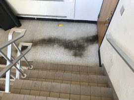 Floor in the SW stairway is covered in grease and soil and need cleaning