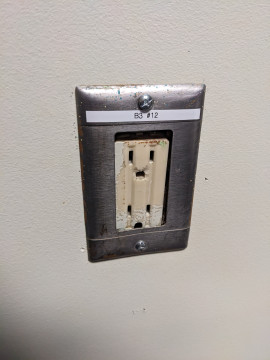 The electrical outlet nearest the mechanical exit door in the billiards esports spacer is sunken in it's box and is too loose to plug in anything. Please replace the outlet with a newer one since it's old.