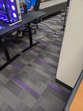 Between the wall of hunts bros and the end of the pc stations there is what looks like pizza sauce on the carpet.