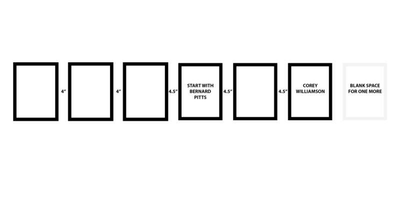 The Director frames will need to be removed, patched, painted and reinstalled closer together. This will add room for Corey's frame and there will be room for one more. I've attached a photo of what I came up with. The first three frames are a little bigger, so they won't be perfect, but the math should be good. Start with Bernard in the center and measure out from both sides. If you have any question or concerns let me know. Audrey/Craig would like this done over spring break (March 10 - 17).