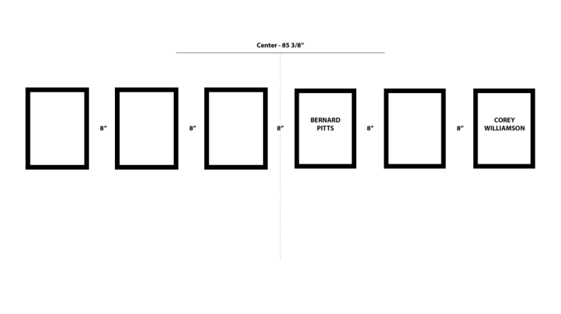 The Director frames will need to be removed, patched, painted and reinstalled as straight as possible and evenly spaced. I've attached a photo of the updated layout. Start in the center (85 3/8”) and work outward. The frames should all be 8" apart. If you have any question or concerns let me know. Audrey/Craig would like this done over spring break (March 10 - 17).