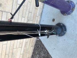 Air pump on the north side of the Union is not working. Also there is a tool that has been cut off of the tool set. The cable should either be removed or the tool replaced. If parts are needed, I have the website for the manufacturer.