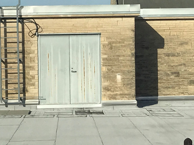The penthouse exterior doors need to be repainted. Current paint has weathered and has rust stains.