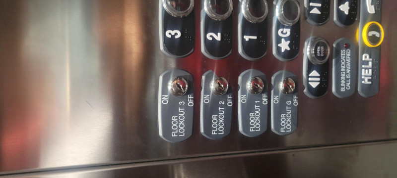 The elevator that goes up to HR, the grey part of it across from floor 2 is broken. There is a picture.