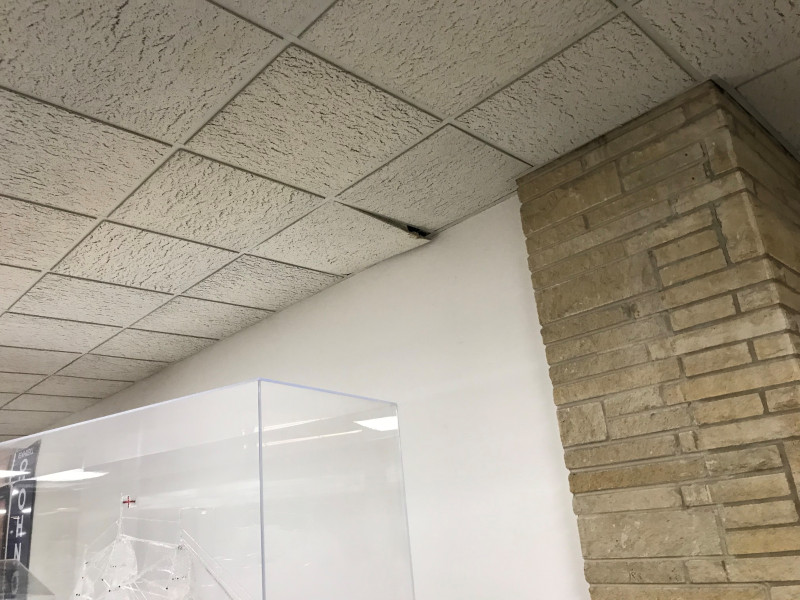 A ceiling tile in the second floor concourse near the KSU door is damaged and needs replacement.