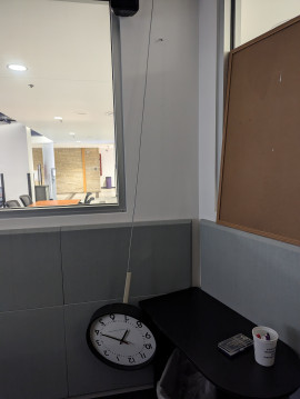The radio station booth has a clock that is mounted to the wall. The clock has fallen off the wall and is dangling by a cord. It needs repaired and rehung.