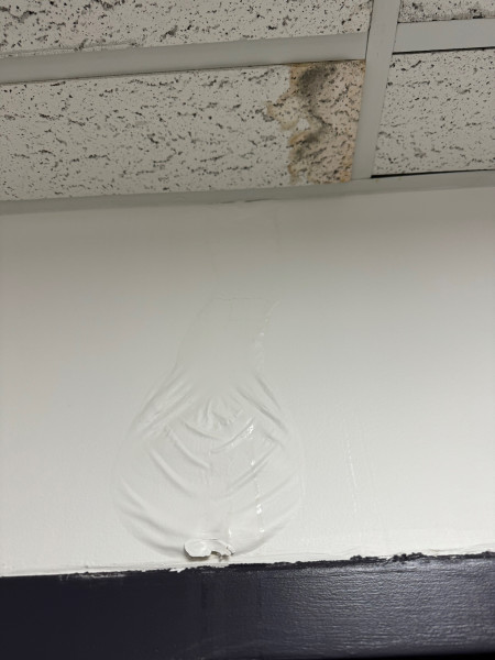 2nd request. During a rain last month, a ceiling leak caused a coat of paint to wrinkle. This same rain soaked a ceiling tile, and it has since molded. This area needs to be repairs and the tile replaced.