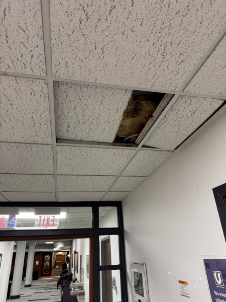 Damaged ceiling tile in Konza Hallway need repair / replaced.
