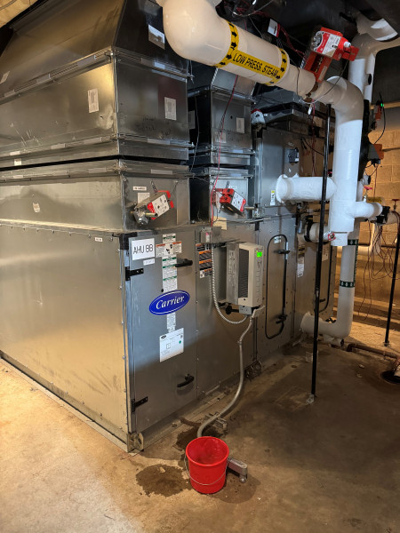 There is a water leak in the area of AHU BB in the Bowling Center mechanical room that needs to be repair soon. We have a bucket collecting the water.