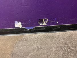 There is a large gash in the wall adjacent to the break-room on ground floor that needs to be repaired.