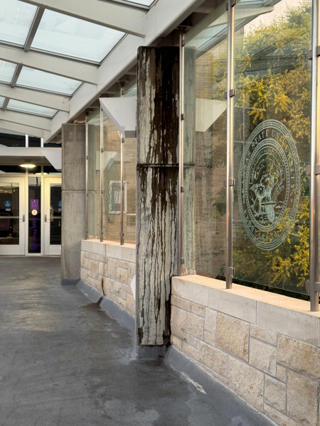 A column on the skywalk has been covered in black residue and needs to be power washed.