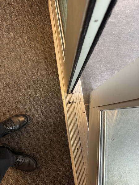 The far east outside entrance door at the north entrance is sticking and does not always open. It may be due to the door sagging; it appears to be rubbing on the threshold.