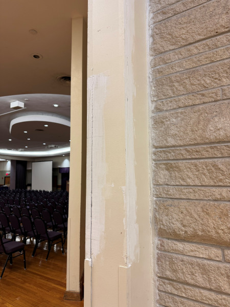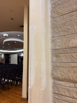 A wall repair was started in the Ballroom and has not been completed. Work needs to be finished.
