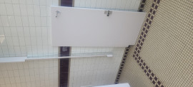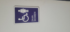 The women's bathroom door is off its hinge, the metal is bent, and the last door is.