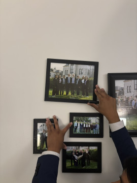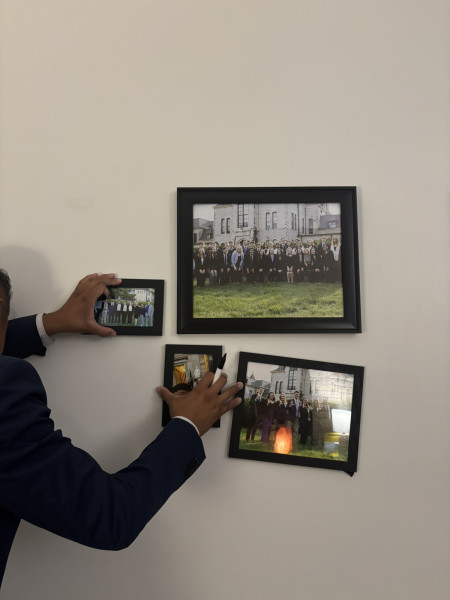 Please hang the frames on our middle table on the wall with the SGA group photo. I've attached photos as to what the layout should be.