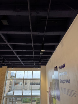 Bank of can lights over stairs near Fireside Lounge are not giving off any illumination.