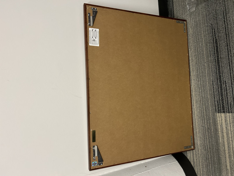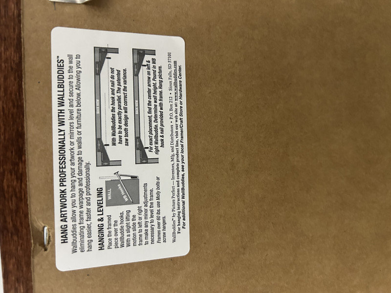 the photo in the "image.jpeg" attachment needs to be taken down and replaced with the large composite photo that we will have on the floor behind the front desk. I have attached the back of the composite so you can see the hardware and the directions included. I have also attached a photo of the wall hanging materials included.